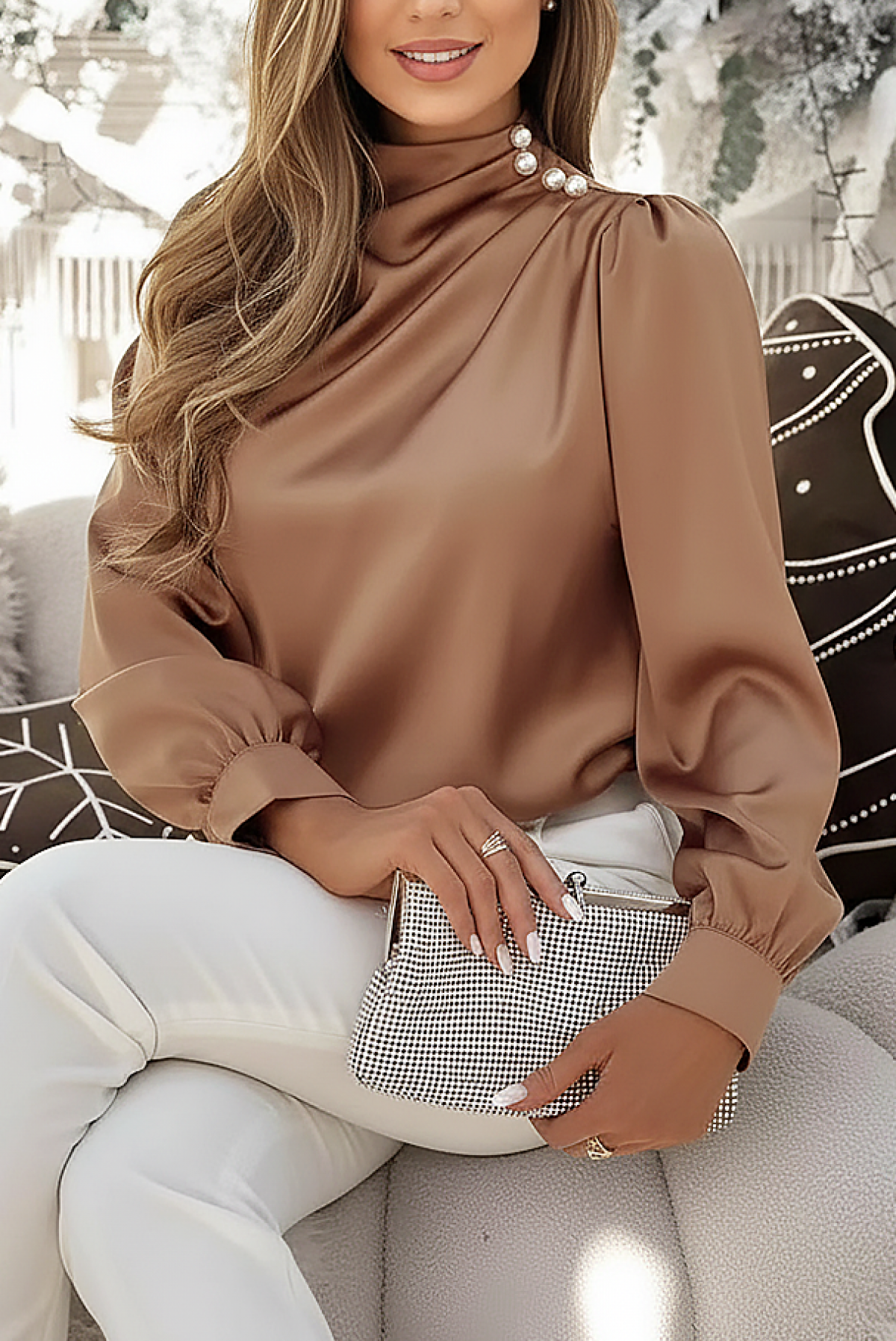 - Bluza ima duge rukave, elegantan kroj i ukrasne bisere na ramenu.