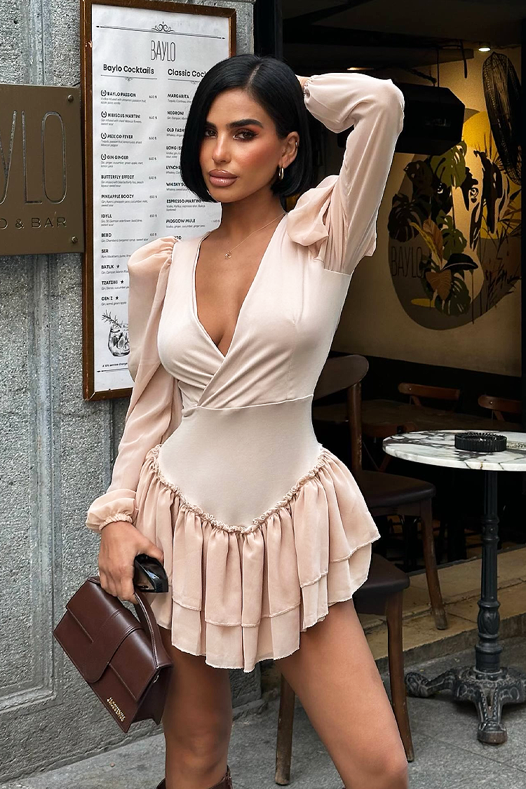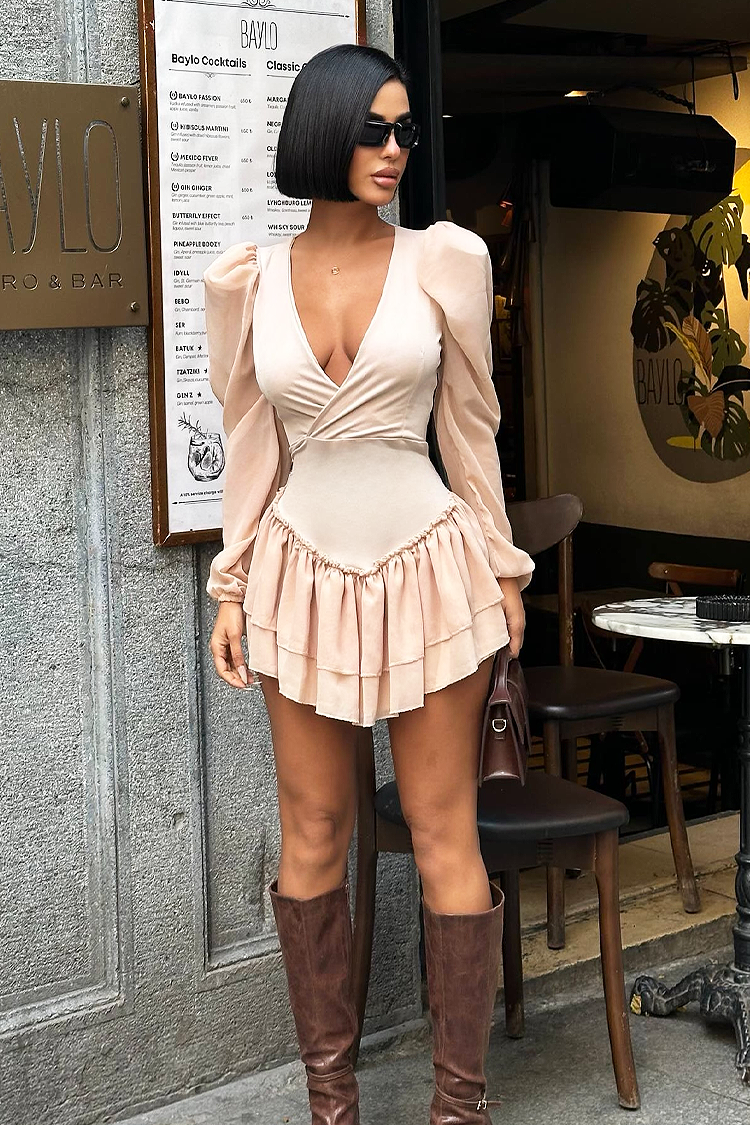 - Za savršen izgled odaberite ovu kratku haljinu atraktivnog dizajna u bež boji.
