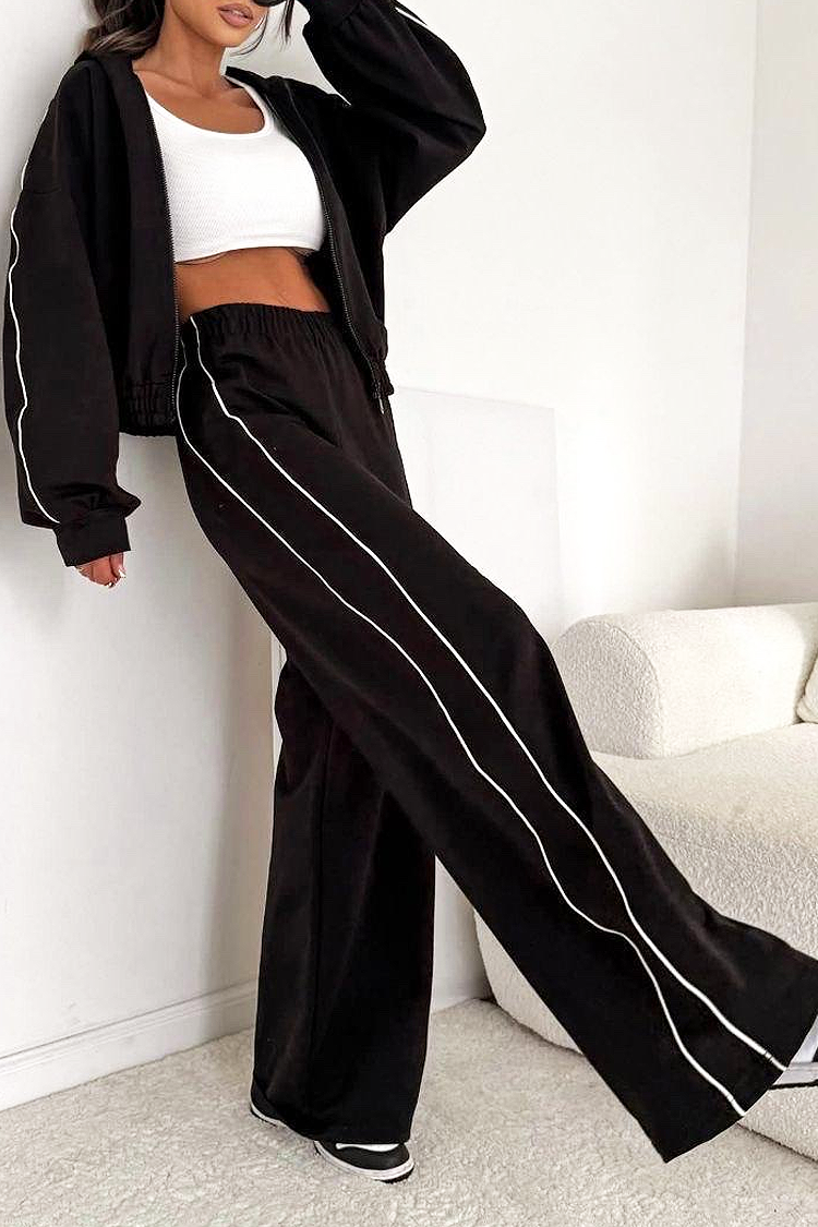 - Majica ima patentni zatvarač i kapuljaču, a hlače visoki struk i široke nogavice.