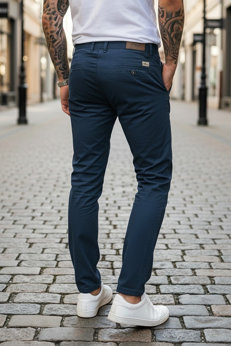 - Osnovni model muških hlača s ravnim nogavicama u tamnoplavoj boji, prikladan za svakodnevne i elegantnije odjevne kombinacije.