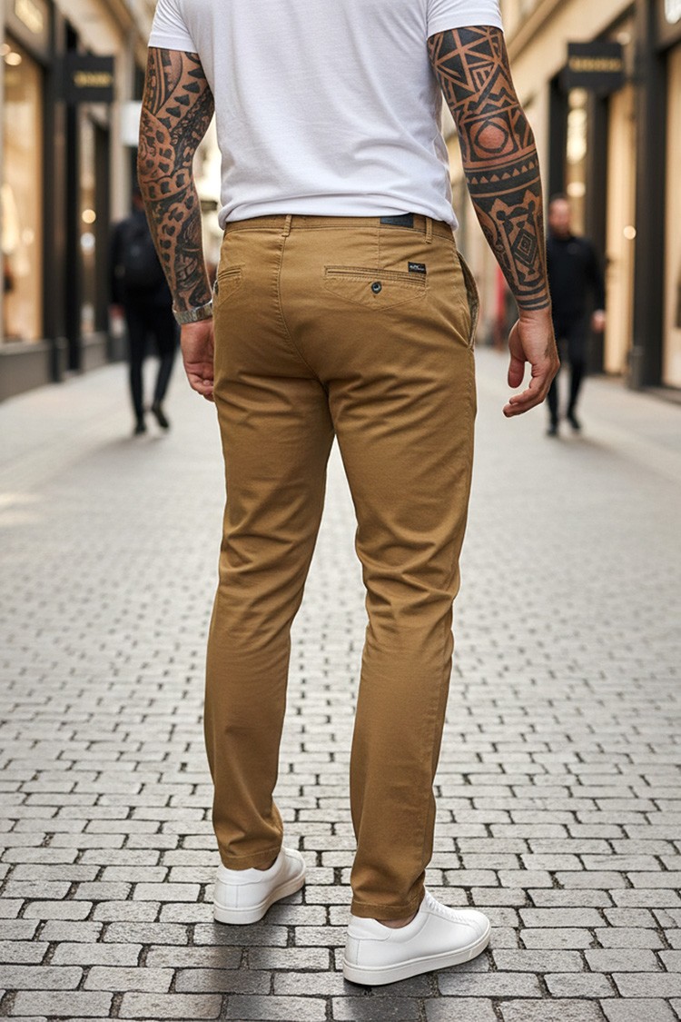 - Osnovni model muških chino hlača s ravnim nogavicama u svijetlosmeđoj boji, prikladan i za svakodnevne i za elegantnije odjevne kombinacije.