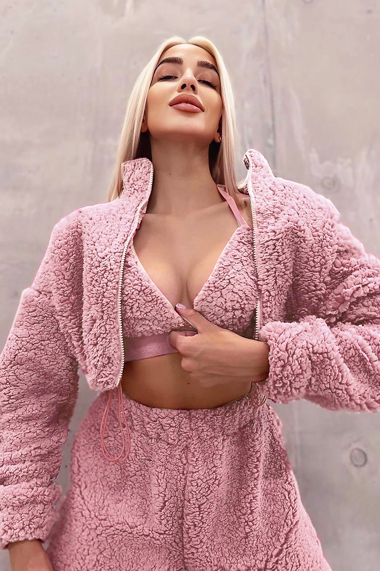 - Dukserica ima patentni zatvarač i kapuljaču, hlače imaju udoban kroj, a korzet ima kratki i izrezan dizajn.