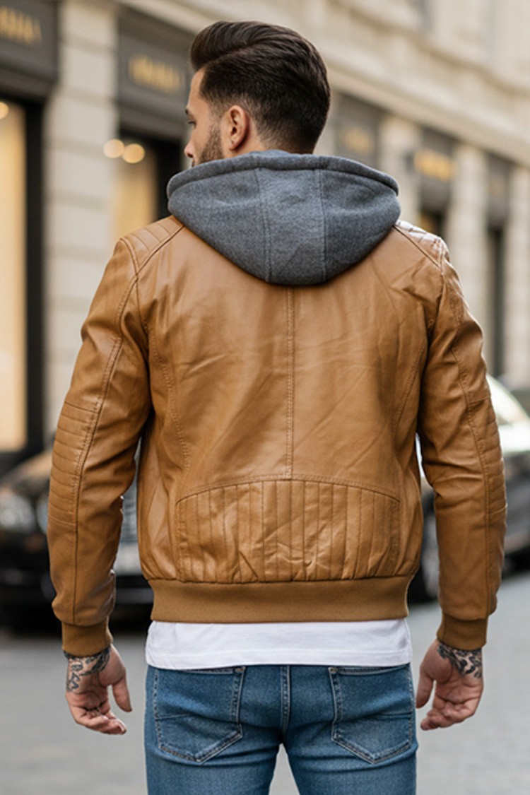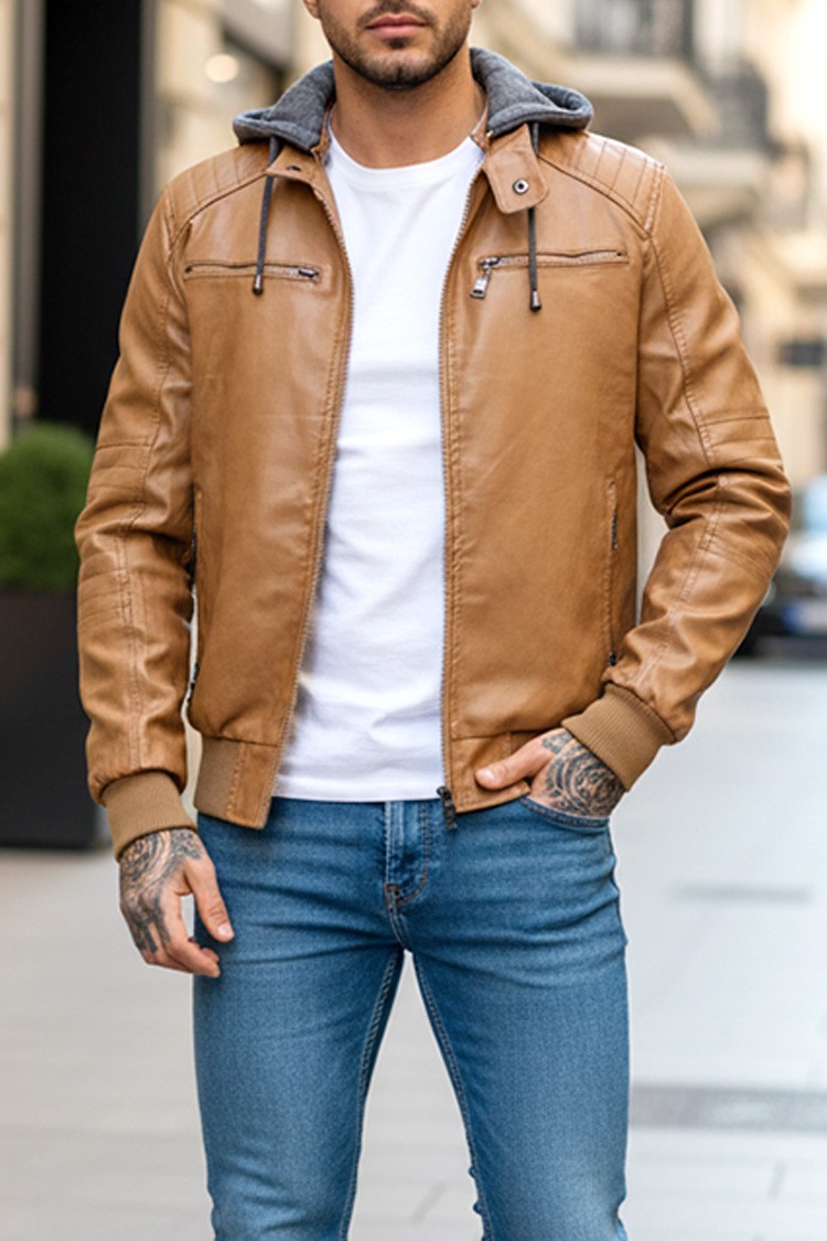 - Muška jakna nestandardnog dizajna s pletenom kapuljačom, prikladna za svakodnevno nošenje.