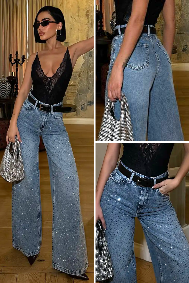 - Model ima visoki struk, široke nogavice i sjajne, ukrasne elemente.
