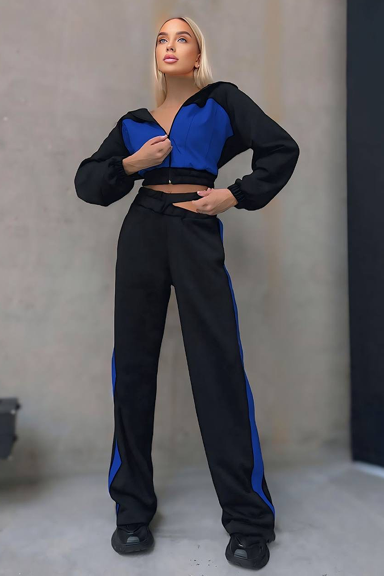 - Majica ima patentni zatvarač i praktičnu kapuljaču, a hlače imaju visoki, elastični struk i široke nogavice.