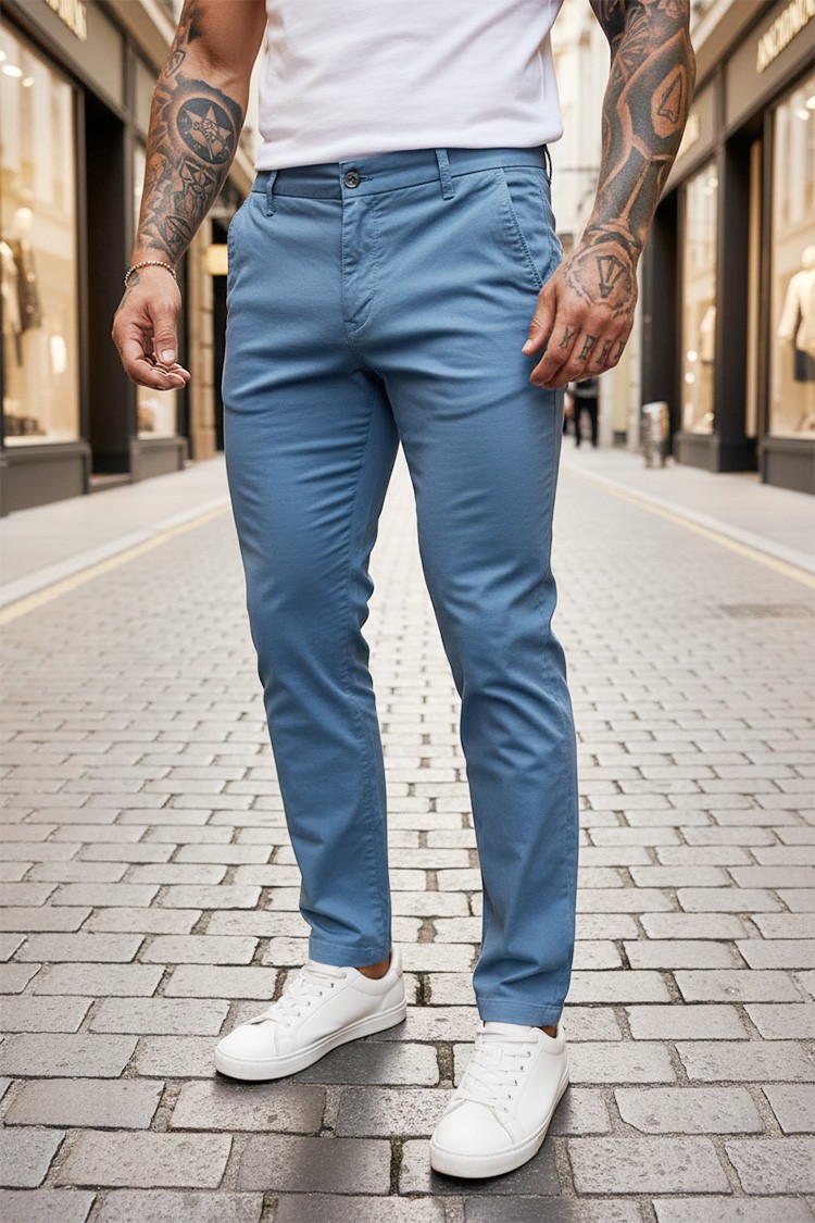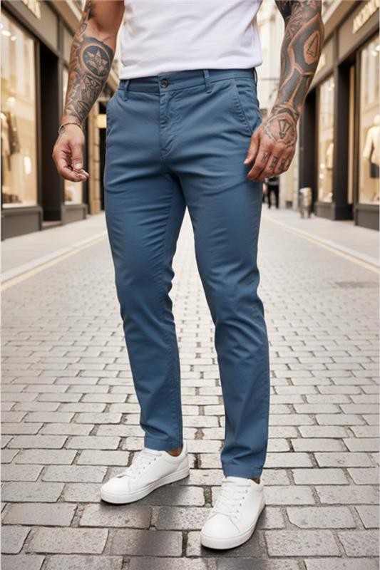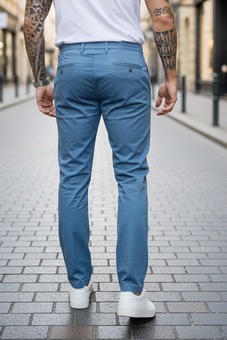 - Osnovni model muških hlača s ravnim nogavicama u svijetloplavoj boji, prikladan za svakodnevne i elegantnije odjevne kombinacije.