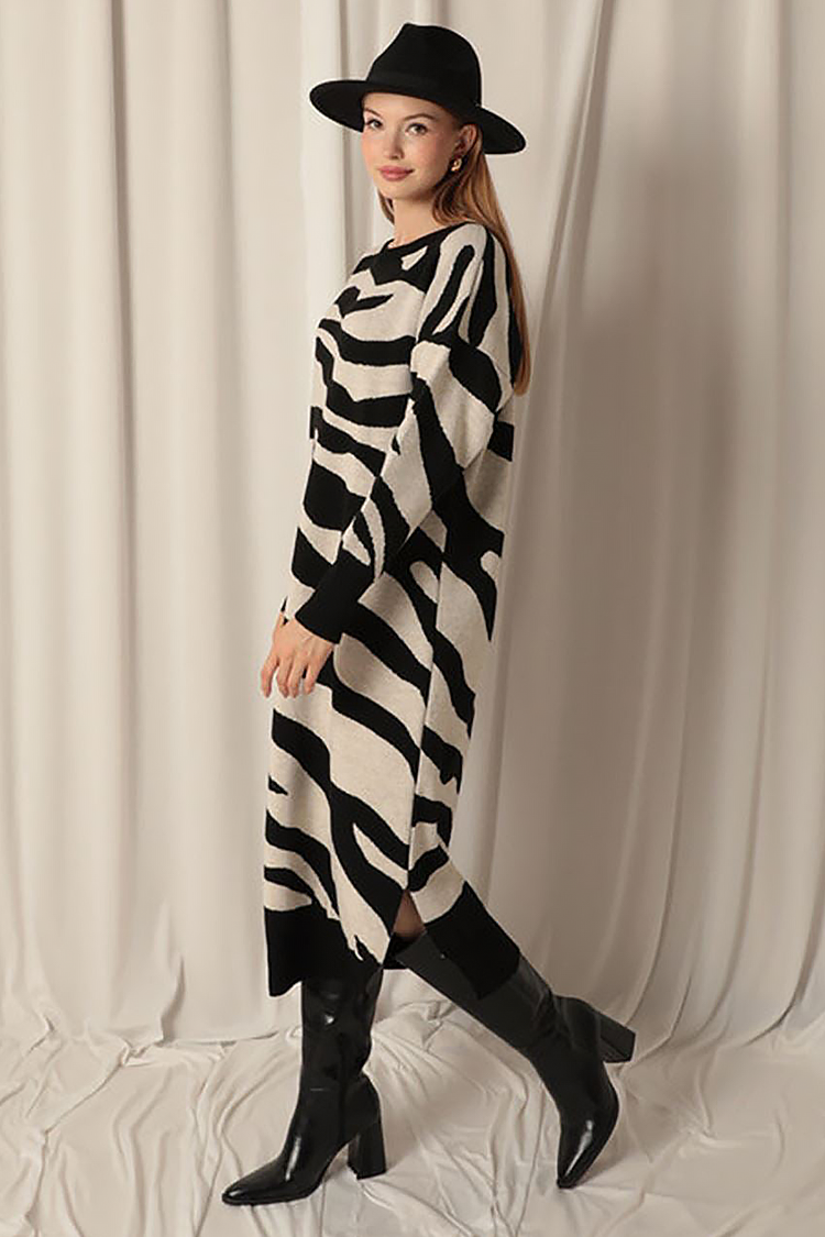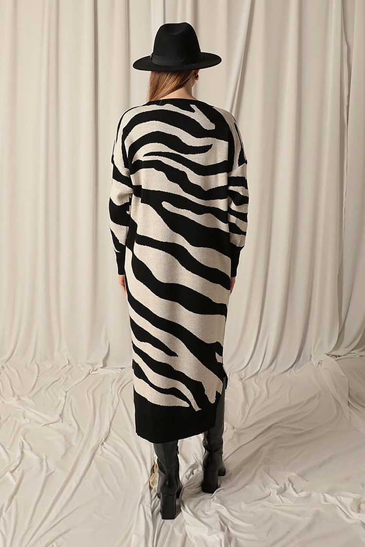 - Model ima klasičan i širok kroj, duge rukave i zebrasti uzor.