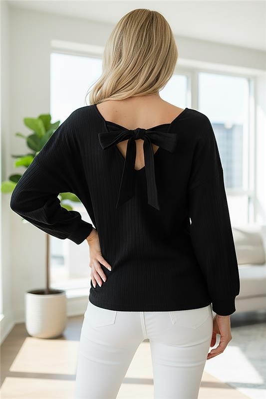 - Model ima V-izrez i ukrasnu vrpcu na leđima.