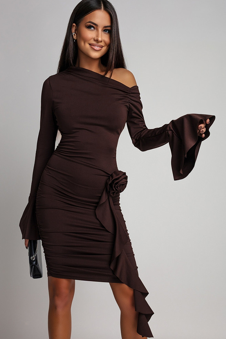 - Model ima jednobojni uzorak, duge rukave, pripijeni kroj, spuštena ramena i spektakularnu ružu u struku.