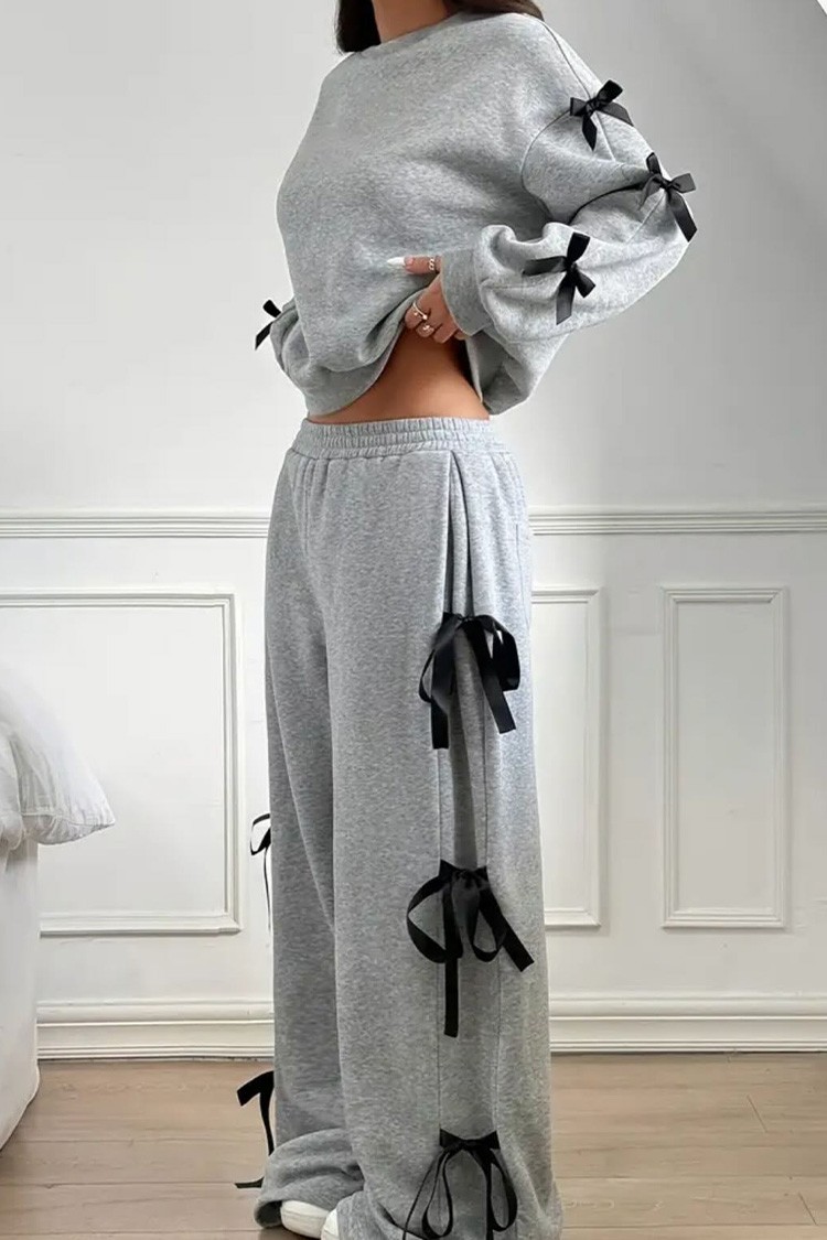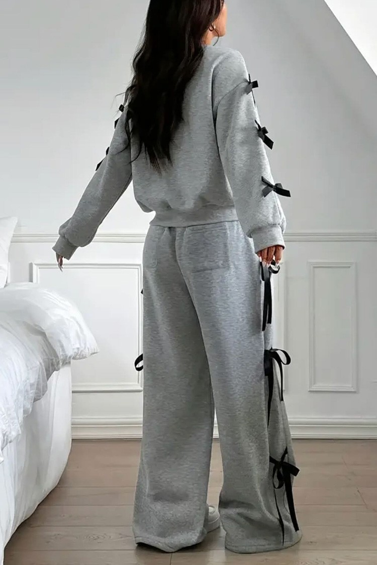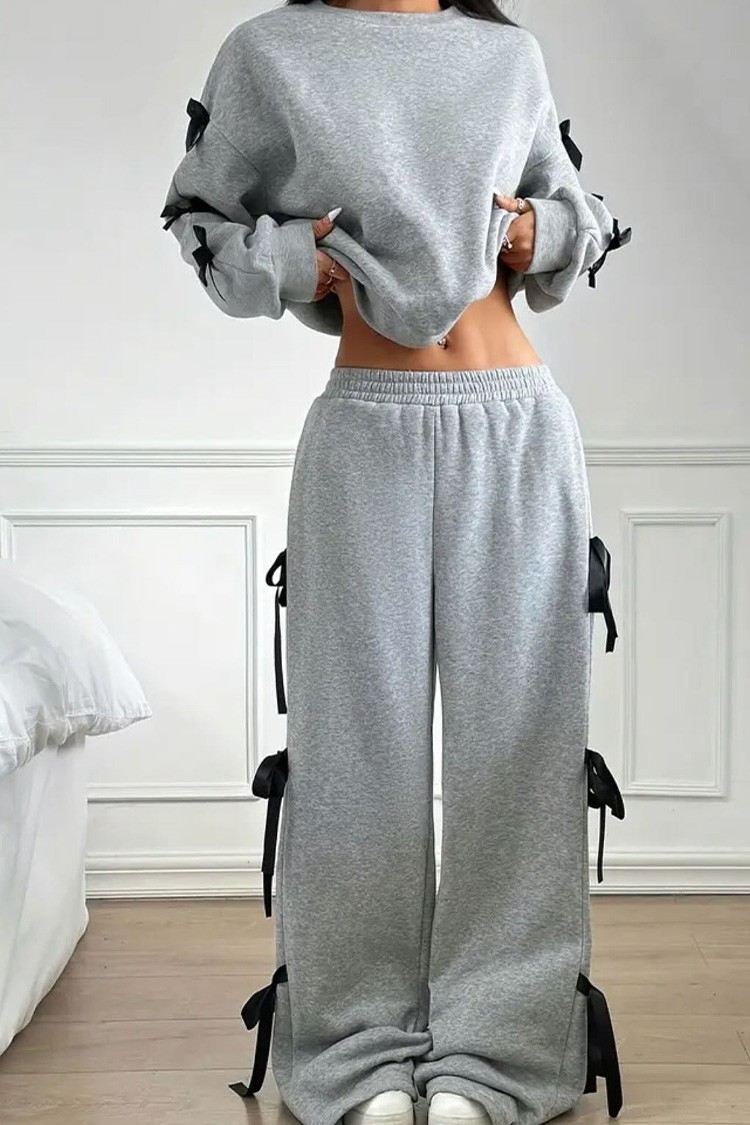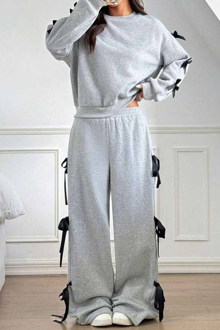 - Set se sastoji od predimenzionirane bluze i hlača širokog kroja s vrpcama cijelom dužinom.