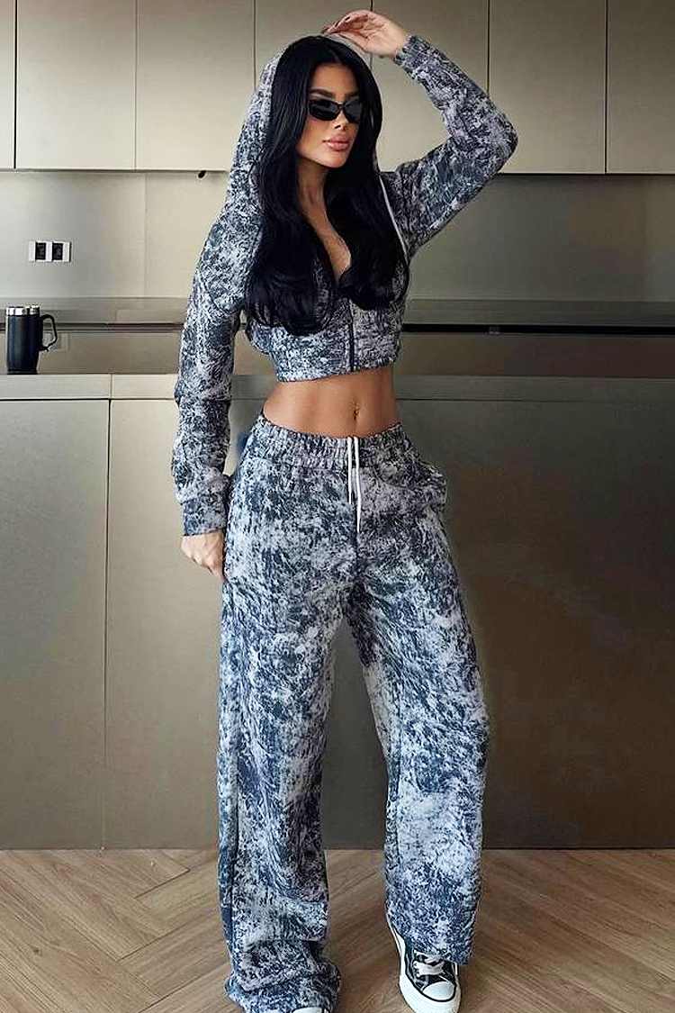 - Majica ima skraćenu duljinu, kapuljaču i patentni zatvarač, a hlače imaju široki kroj.