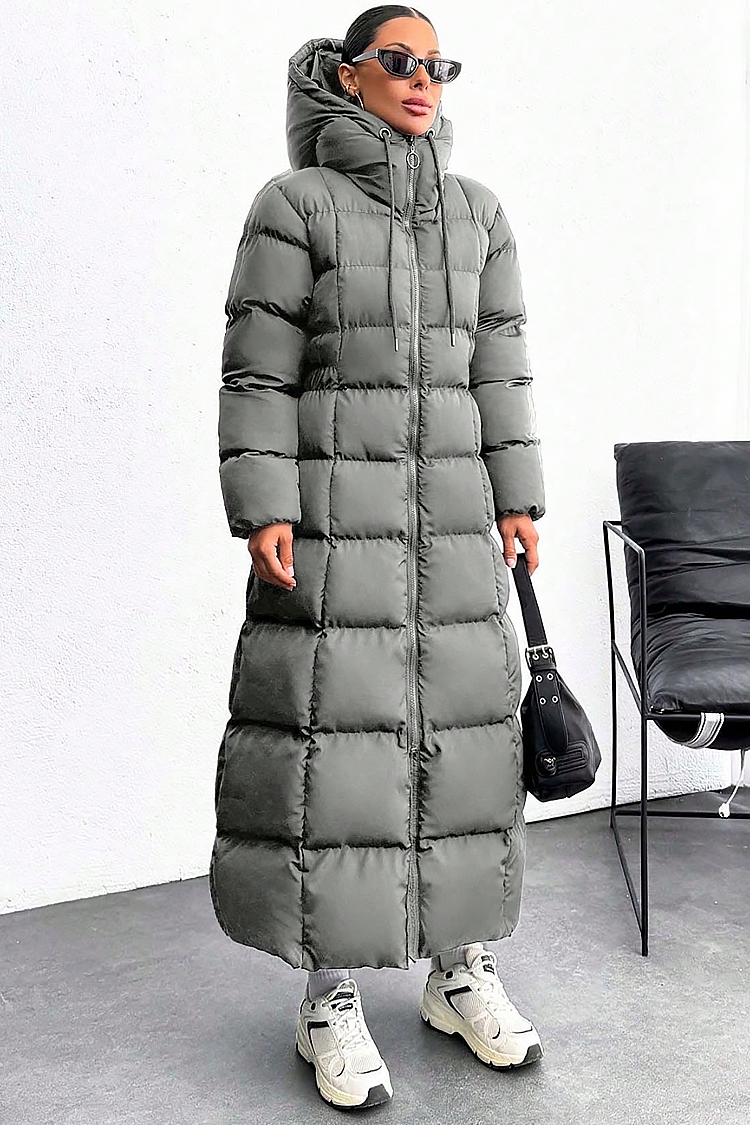 - Model ima široki kroj, dugu duljinu, praktične džepove, visoki ovratnik i kapuljaču s vezicama.