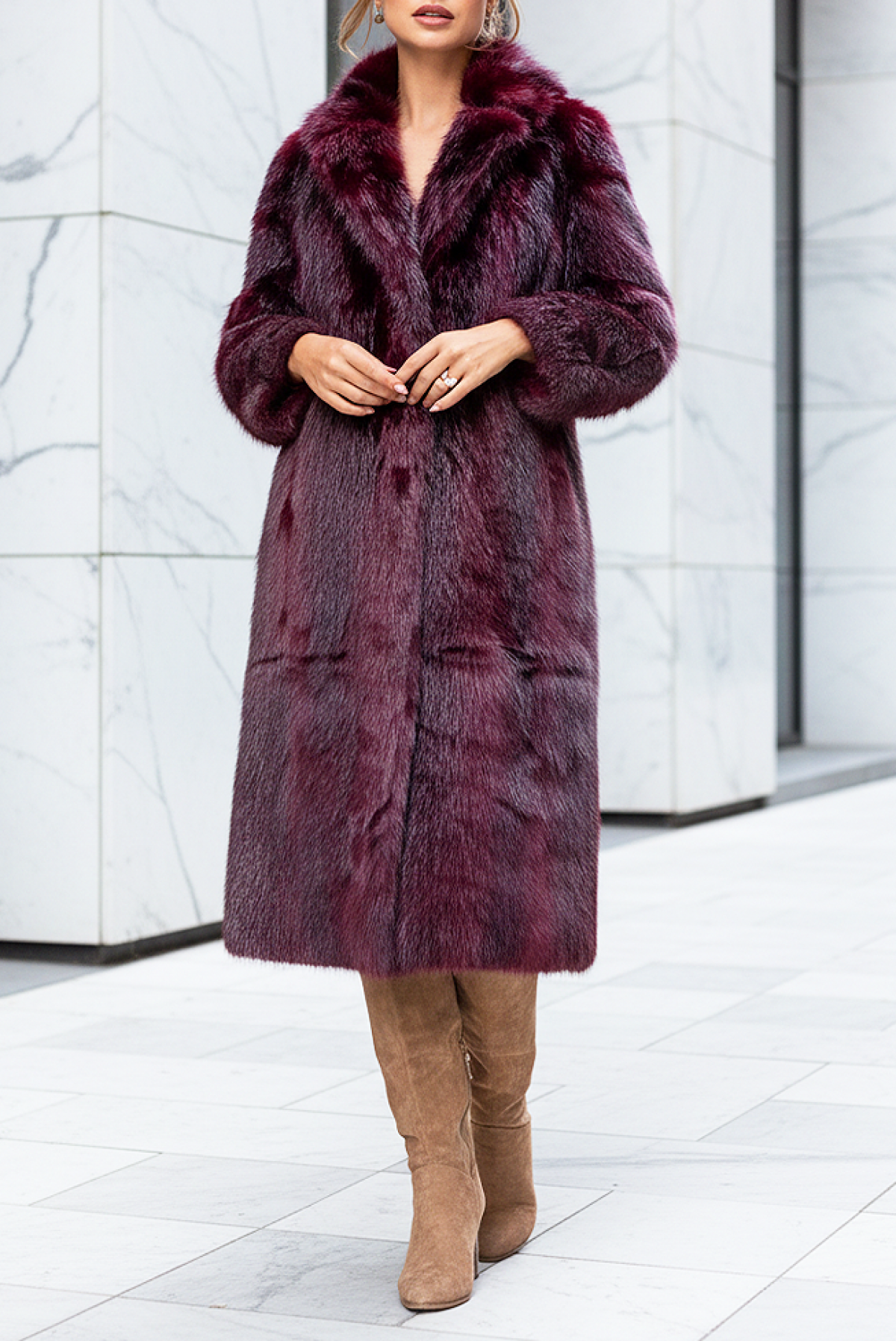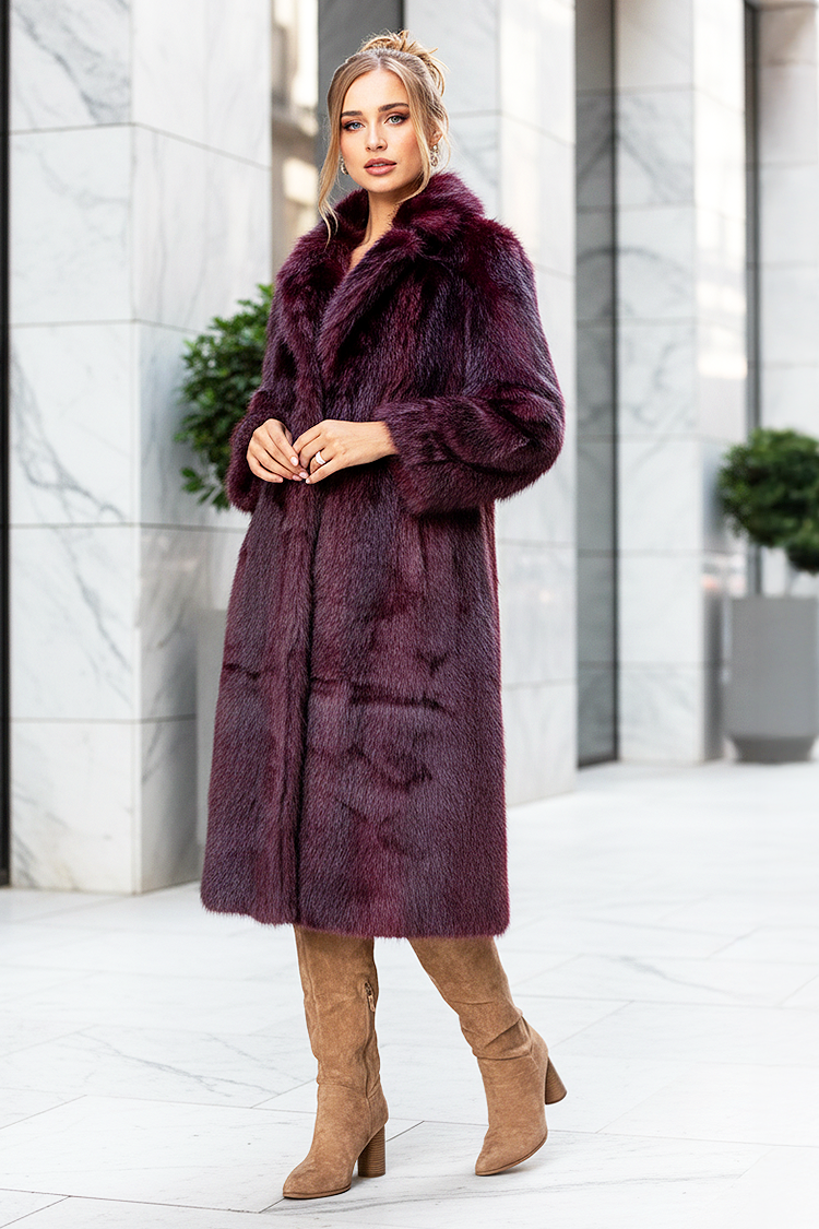 - Model ima midi duljinu i udoban kroj, voluminozan ovratnik i bordo boju.