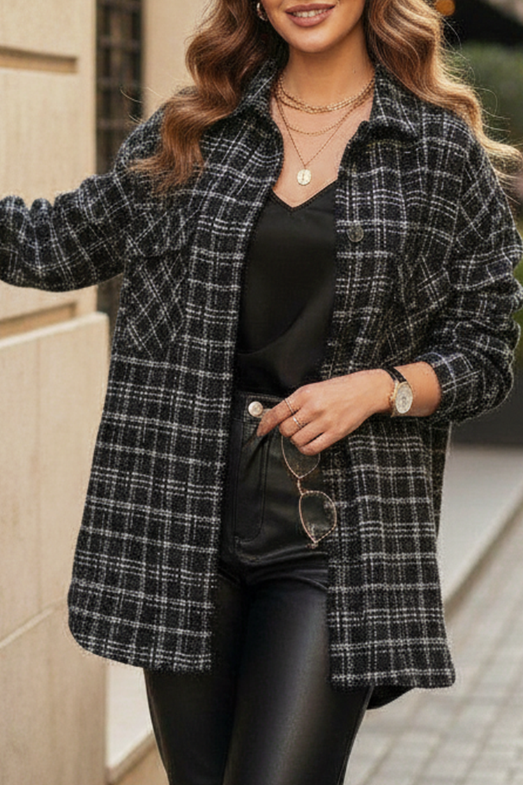 - Model ima klasičnu duljinu, ovratnik, ukrasni džep i gumbe.