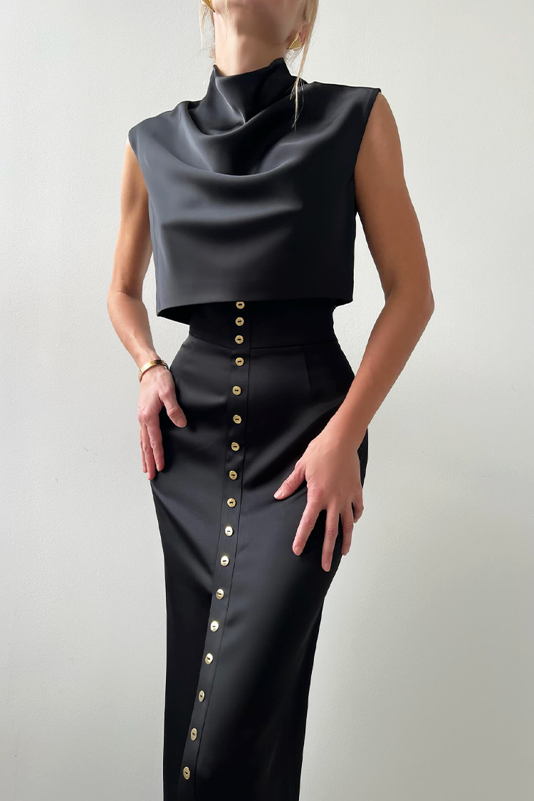 - Suknja ima visoki struk, ravan kroj i gumbe po cijeloj duljini, što omogućuje nošenje s prorezom.
