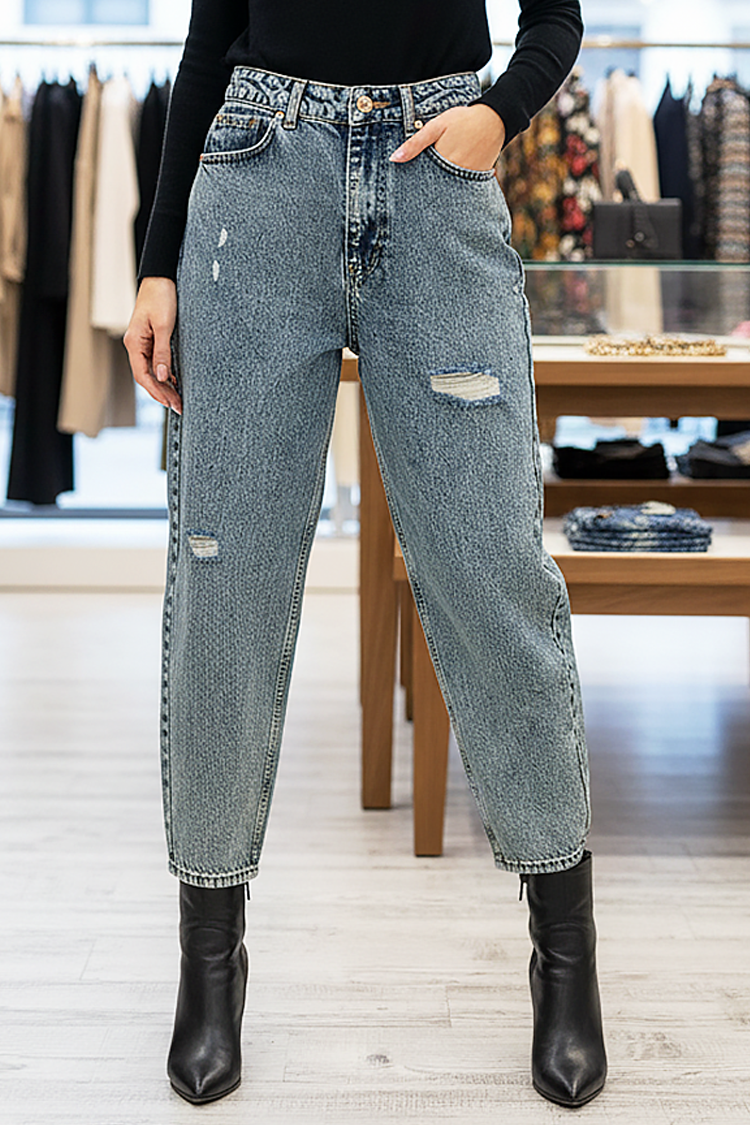 - Model ima visoki struk, moderan iznošeni efekt i klasičan plavi uzorak.