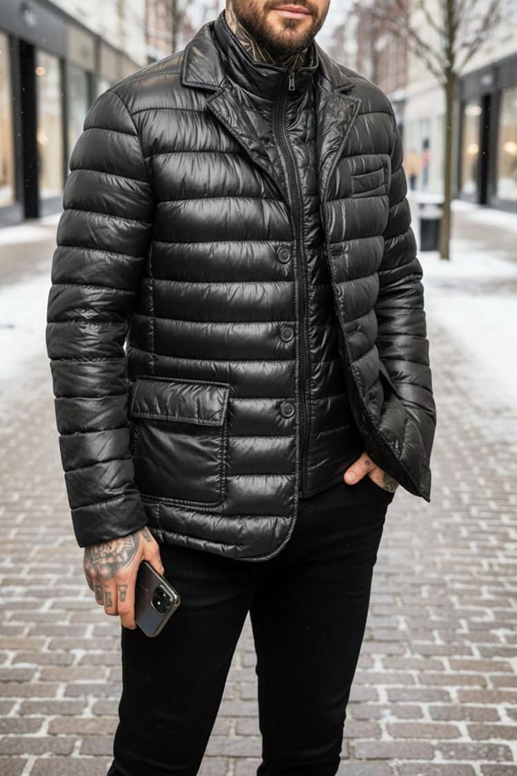 - Udobna muška jakna s horizontalnim, prošivenim dizajnom i reverom u crnoj boji sa sportsko-svakodnevnim stilom.
