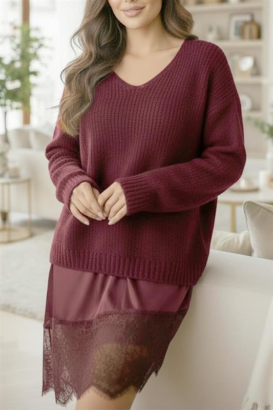 - Model ima široki kroj, klasičan dekolte i kombiniranu tkaninu s čipkom na rubovima.