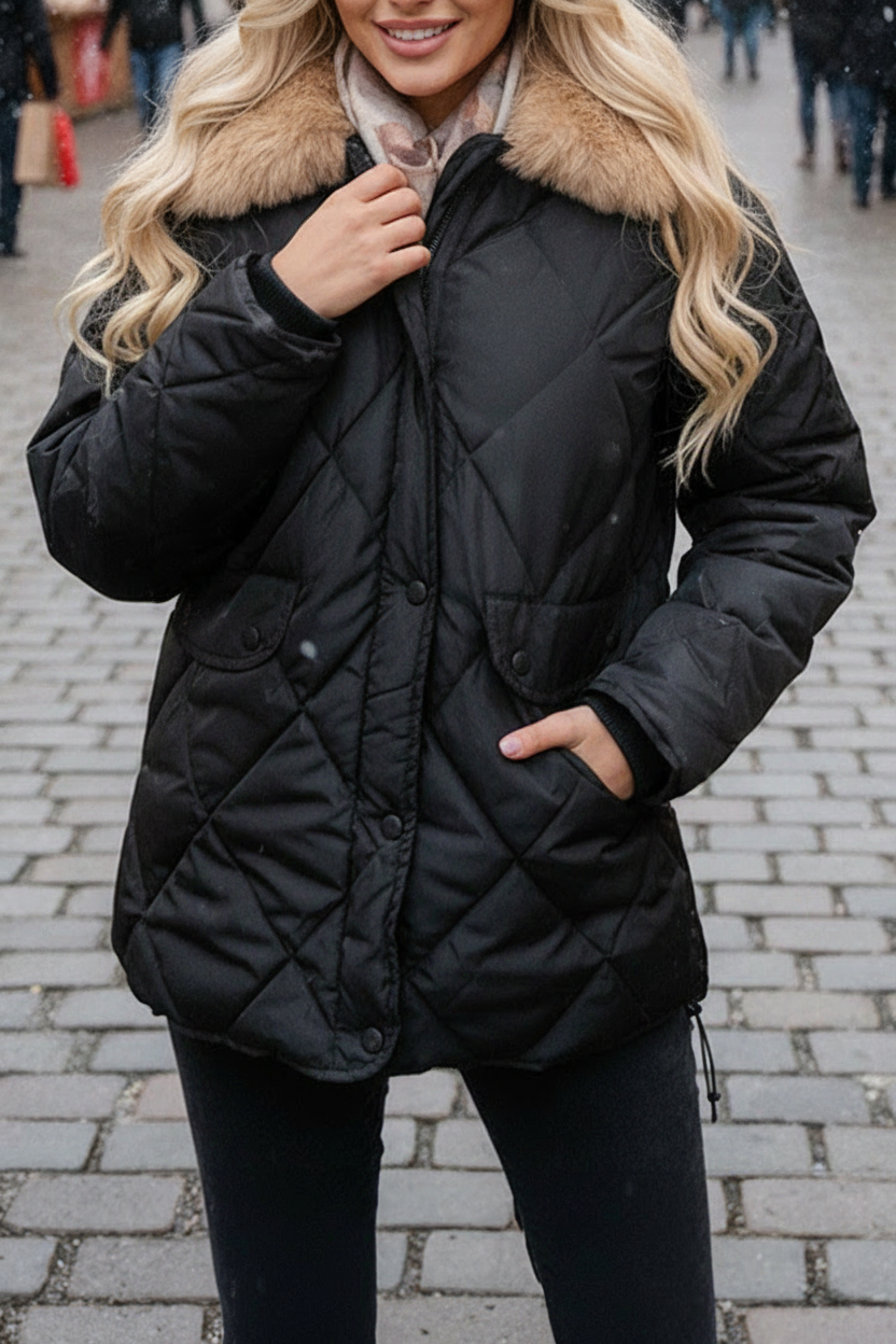 - Model ima udoban kroj, kopča se gumbima i patentnim zatvaračem, voluminozni ovratnik s perjem i džepove s obje strane.