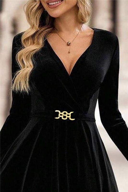 - Model ima V-izrez, duge rukave, elegantan kroj i remen sprijeda.
