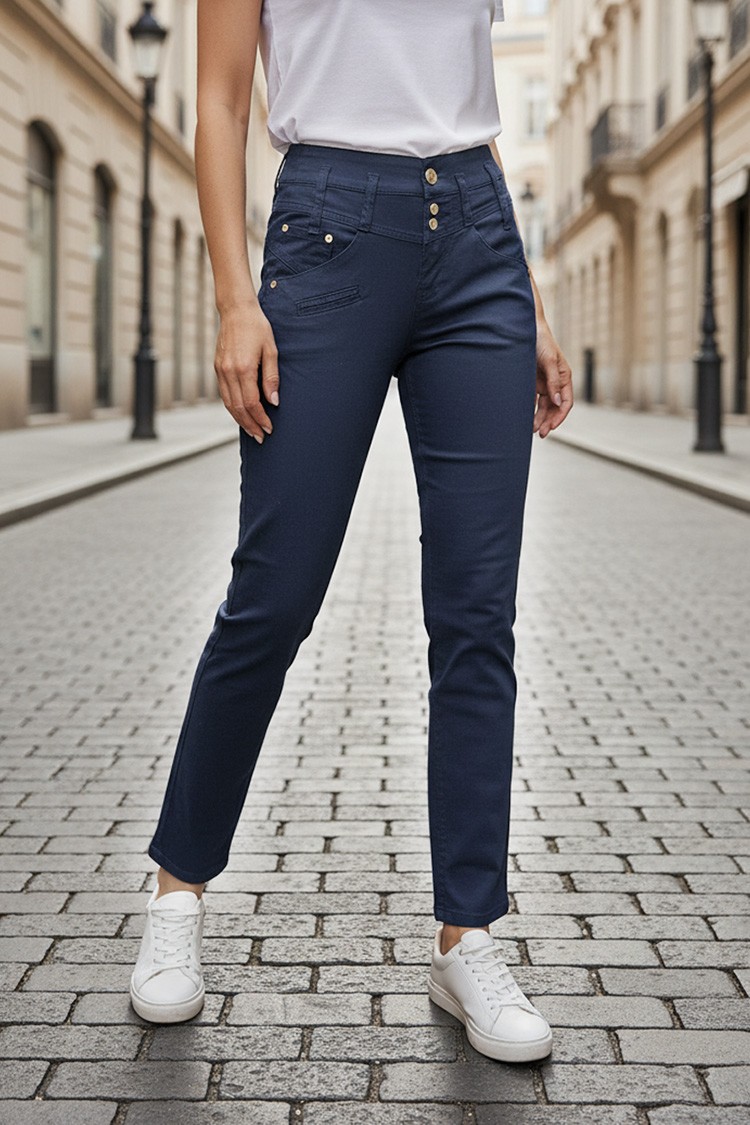 - Hlače imaju visoki struk za savršeno pristajanje i oblik. Model se kopča gumbima.