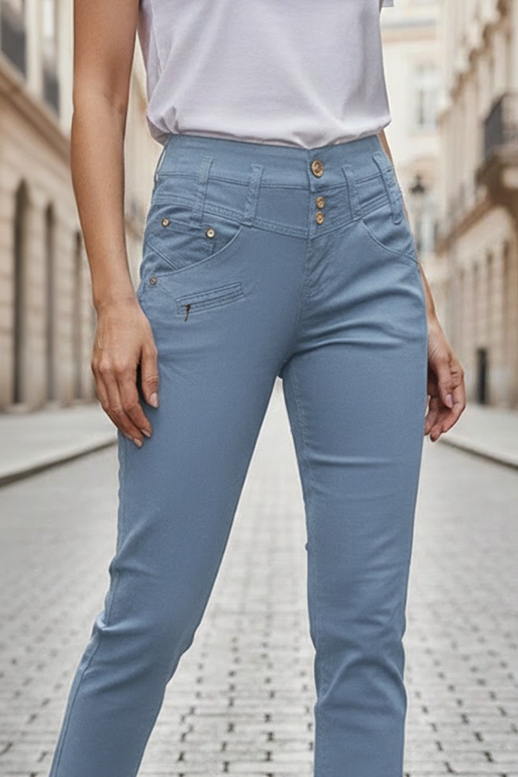 - Hlače imaju visoki struk za savršeno pristajanje i oblik. Model se kopča gumbima.