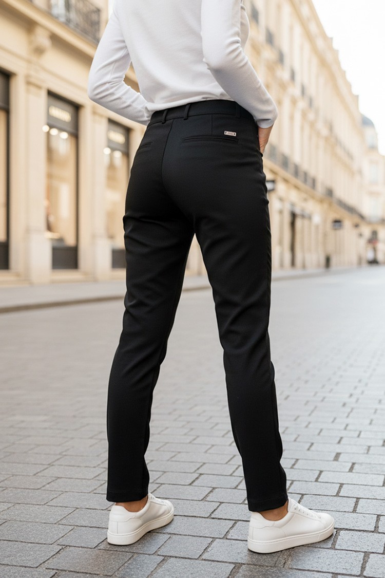 - Elegantne ženske hlače čistog dizajna i praktičnih džepova u klasičnoj crnoj boji.