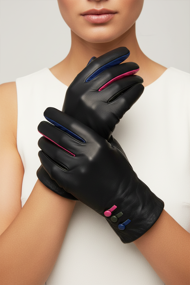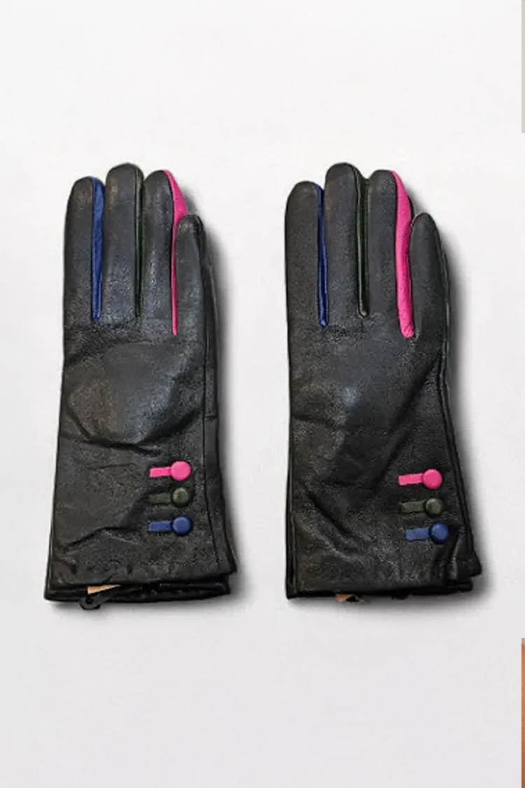 - Stvorite impresivan modni izgled s ženskim kožnim rukavicama u crnoj boji i šarenim detaljima na rubovima.