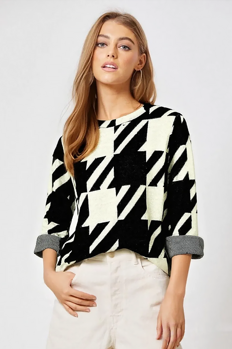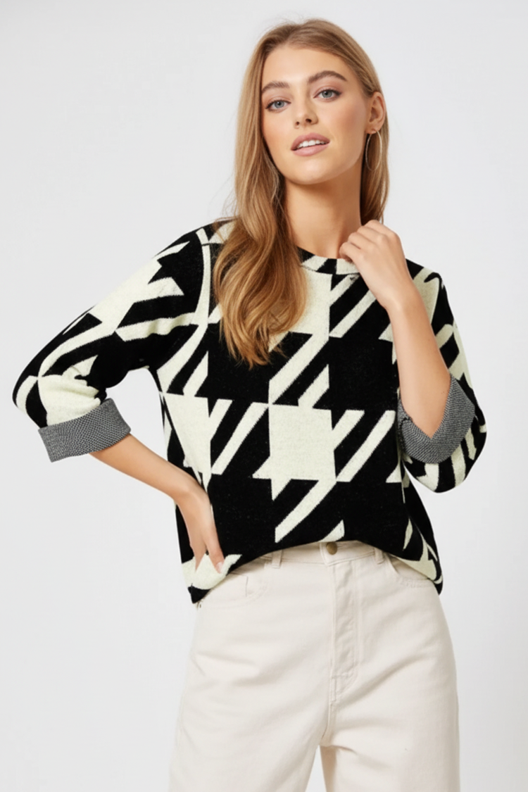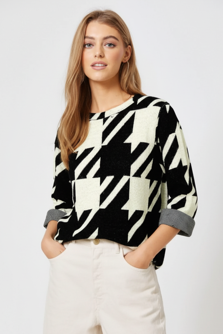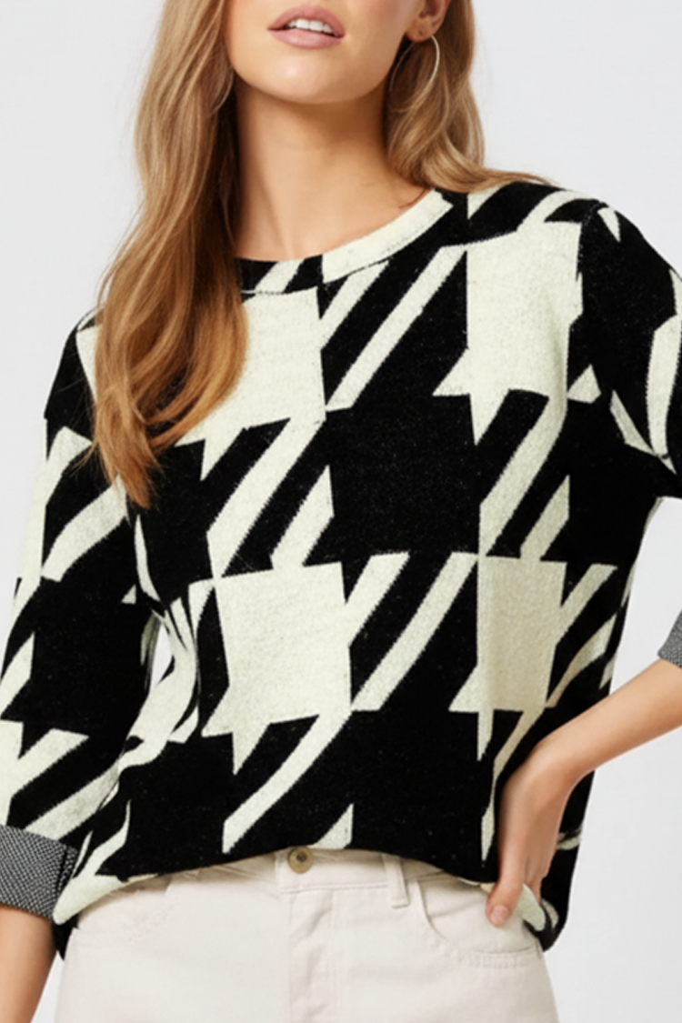- Model ima udoban kroj, okrugli izrez i crno-bijeli uzorak.