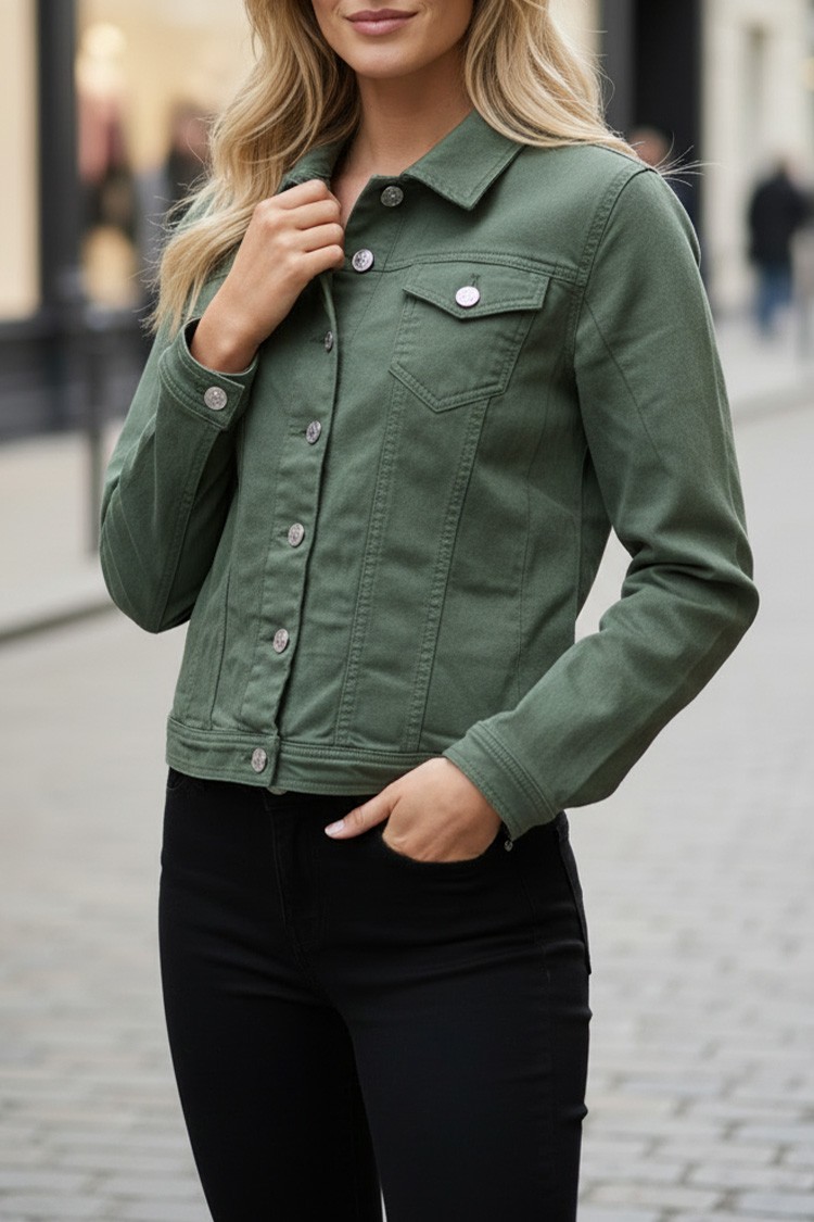- Moderna ženska jakna u kaki boji, pogodna za razne modne kombinacije.