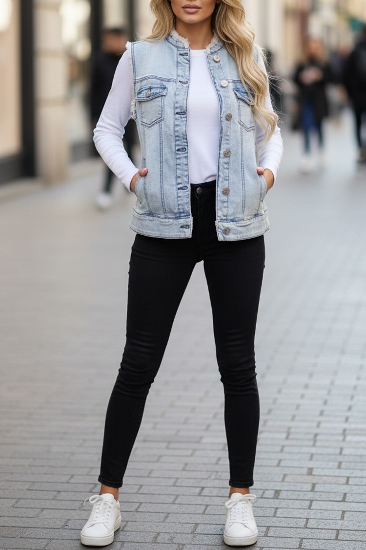 - Moderni ženski traper prsluk u svijetloplavoj boji s izbijeljenim efektom, pogodan za razne modne kombinacije.