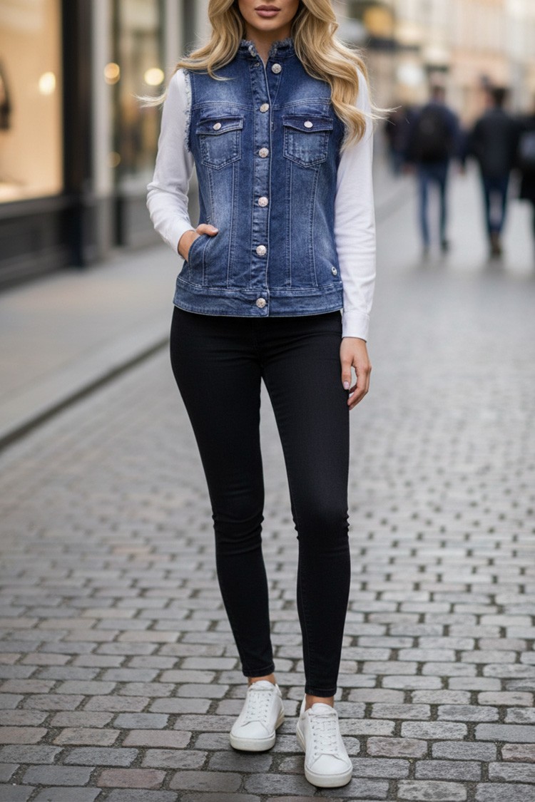 - Moderni ženski traper prsluk u tamnoplavoj boji s izbijeljenim efektom, pogodan za razne modne kombinacije.