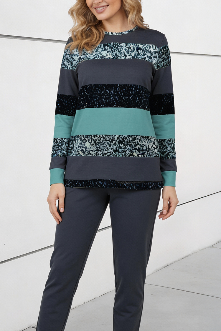 - Bluza ima okrugli izrez i široki kroj, a hlače visoki struk i široke nogavice.