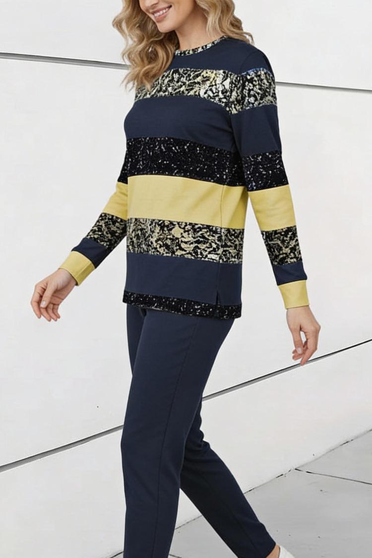 - Bluza ima okrugli izrez i široki kroj, a hlače visoki struk i široke nogavice.