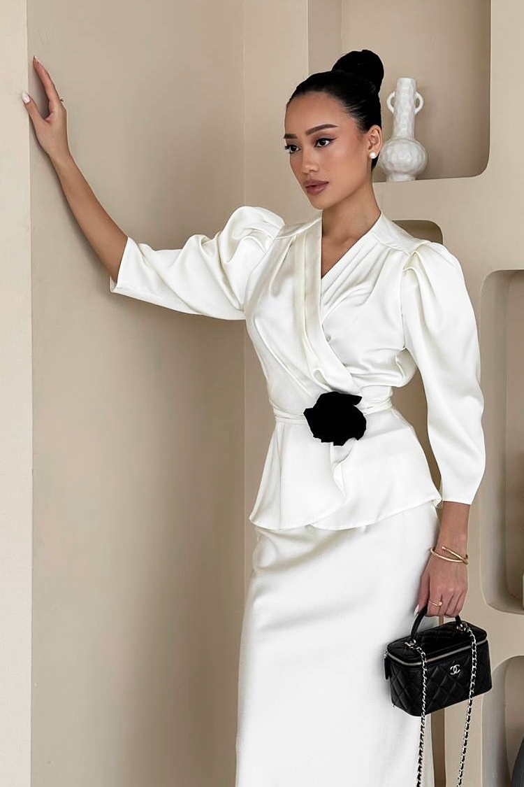 - Košulja ima elegantan kroj, puf rukave i atraktivnu crnu ružu, a suknja ima pripijeni dizajn i midi duljinu.