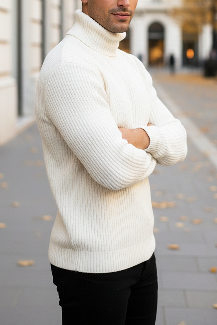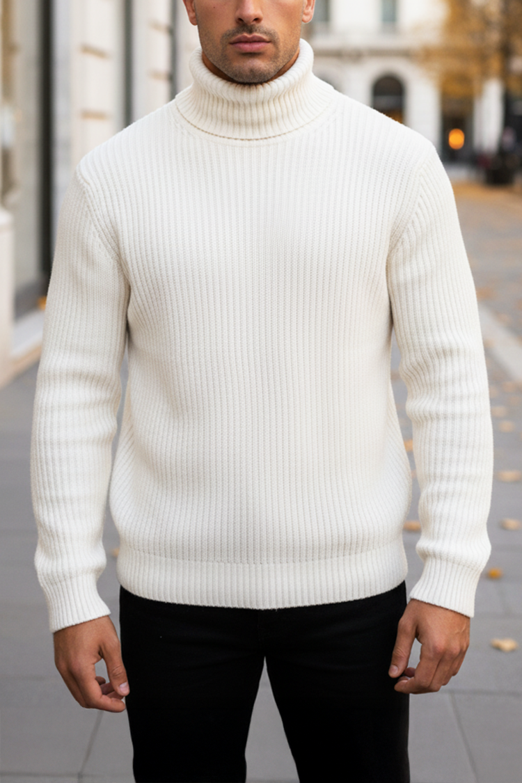 - Topli muški džemper s polo ovratnikom i jednostavnim dizajnom u bijeloj boji, pogodan za razne modne kombinacije.