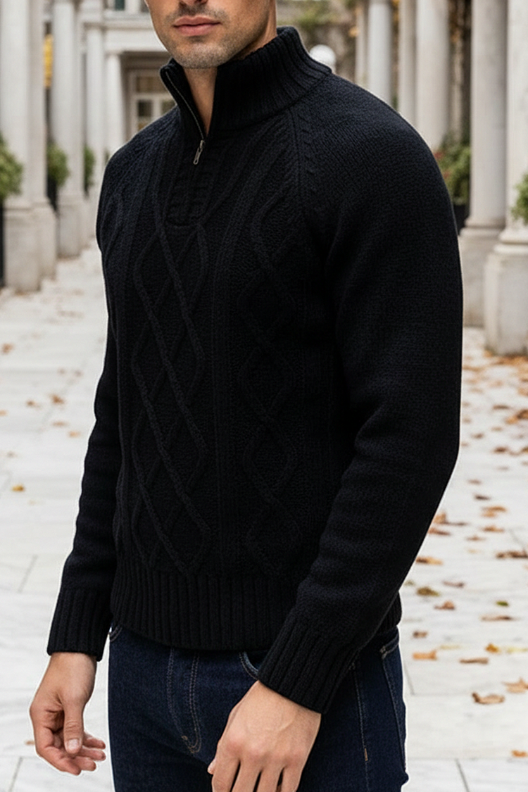 - Topli muški džemper s patentnim zatvaračem i reljefnim motivima u crnoj boji, pogodan za razne modne kombinacije.