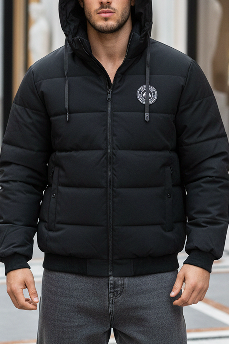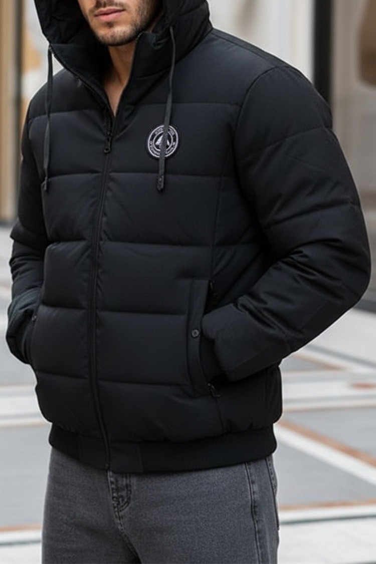 - Praktična i topla muška jakna s logotipom, džepovima i kapuljačom s podesivim vezicama, kombinira udobnost i moderan urbani dizajn.