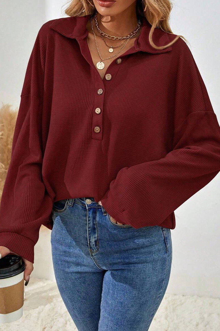 - Bluza ima duge rukave, predimenzionirani kroj, gumbe i ovratnik.
