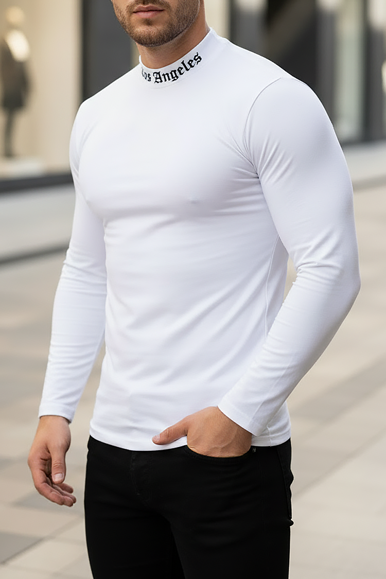 - Aktualni model muške bluze s uskim krojem i printanim ovratnikom u bijeloj boji.