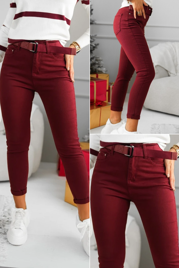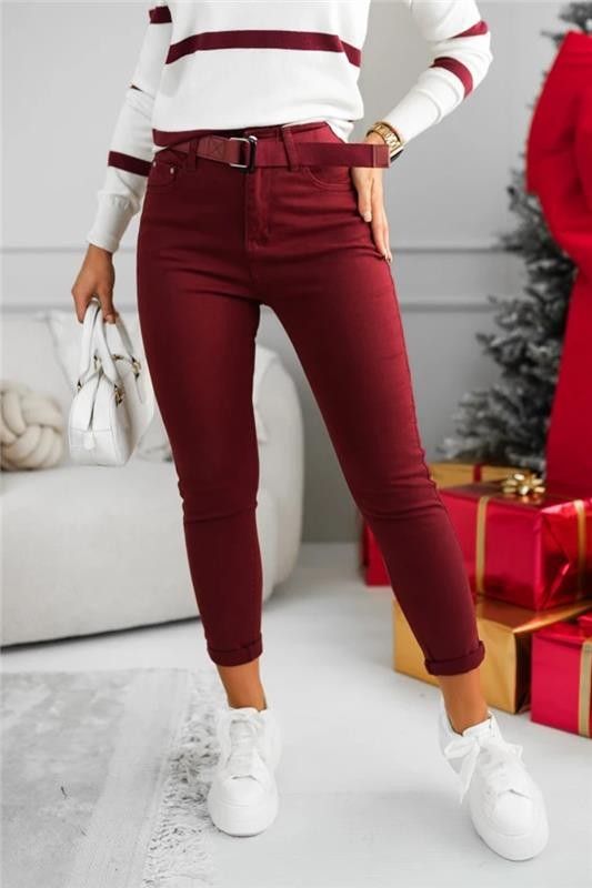 - Čisti model ženskih traperica u bordo boji, prikladan za svakodnevni život ili šetnju.