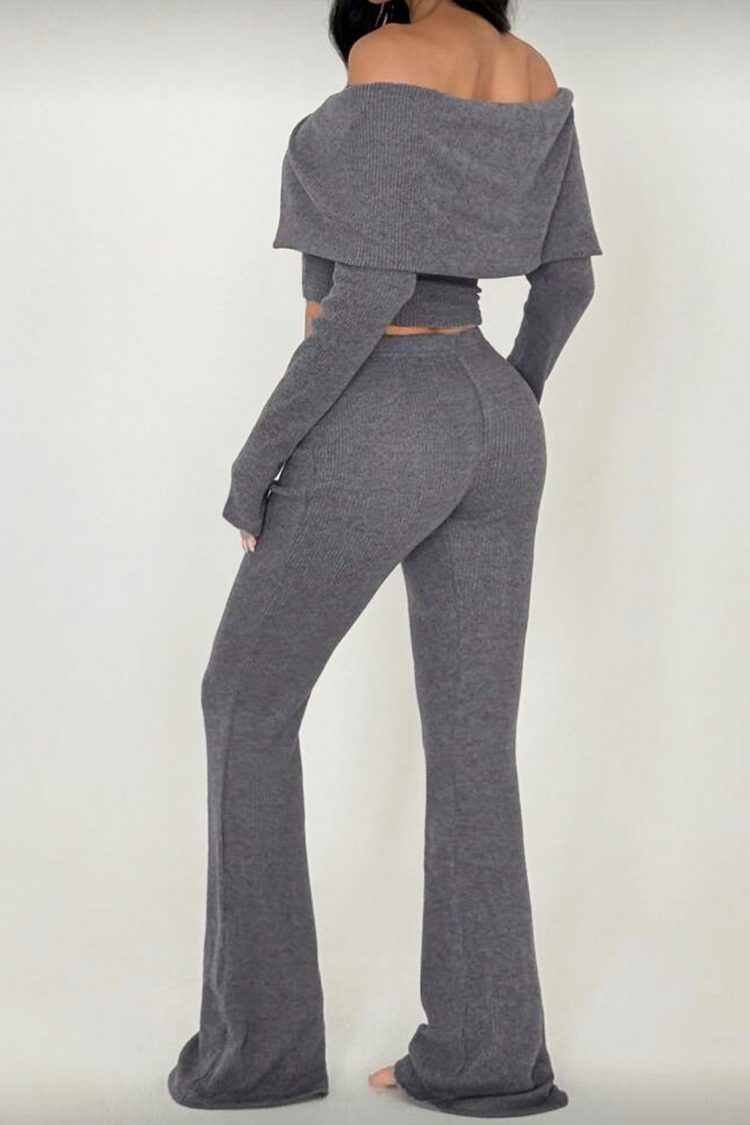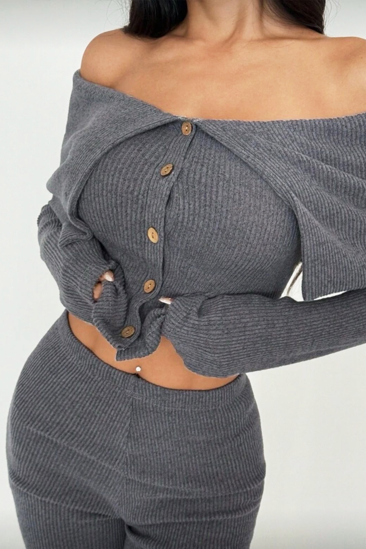 - Bluza ima spuštena ramena, gumbe i skraćenu duljinu, a hlače imaju visoki struk i pripijeni kroj.