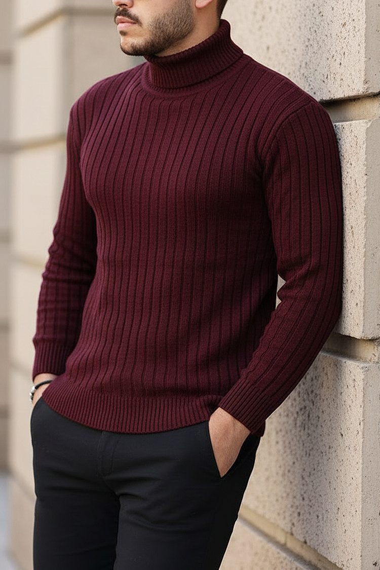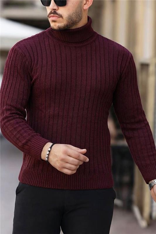 - Udoban muški džemper s polo ovratnikom i vertikalnim rebrastim uzorkom u bordo boji, pogodan za razne modne kombinacije.