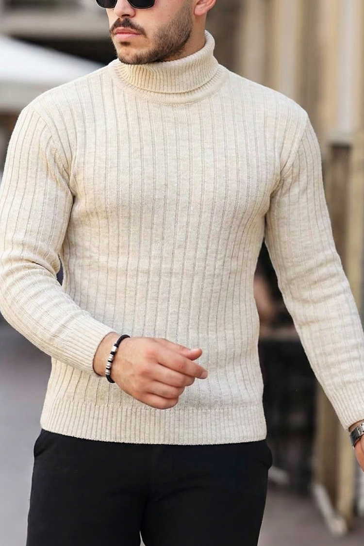 - Udoban muški džemper s polo ovratnikom i vertikalnim rebrastim uzorkom u ecru boji, pogodan za razne modne kombinacije.