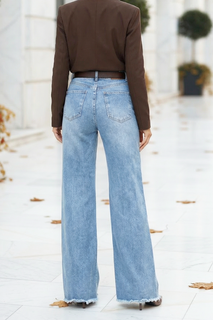 - Model ima visoki struk, široki kroj i svijetloplavi uzorak.