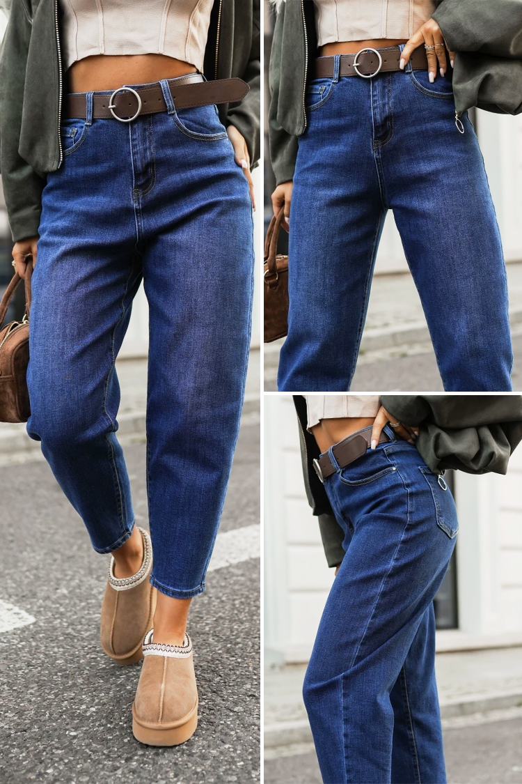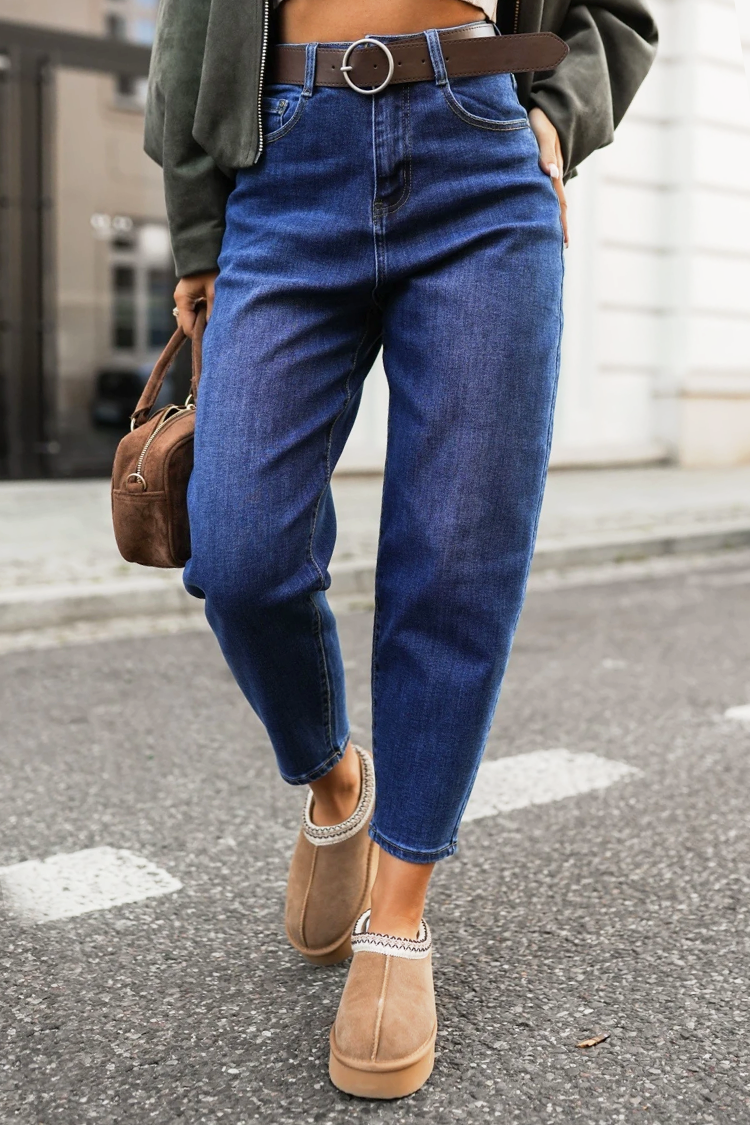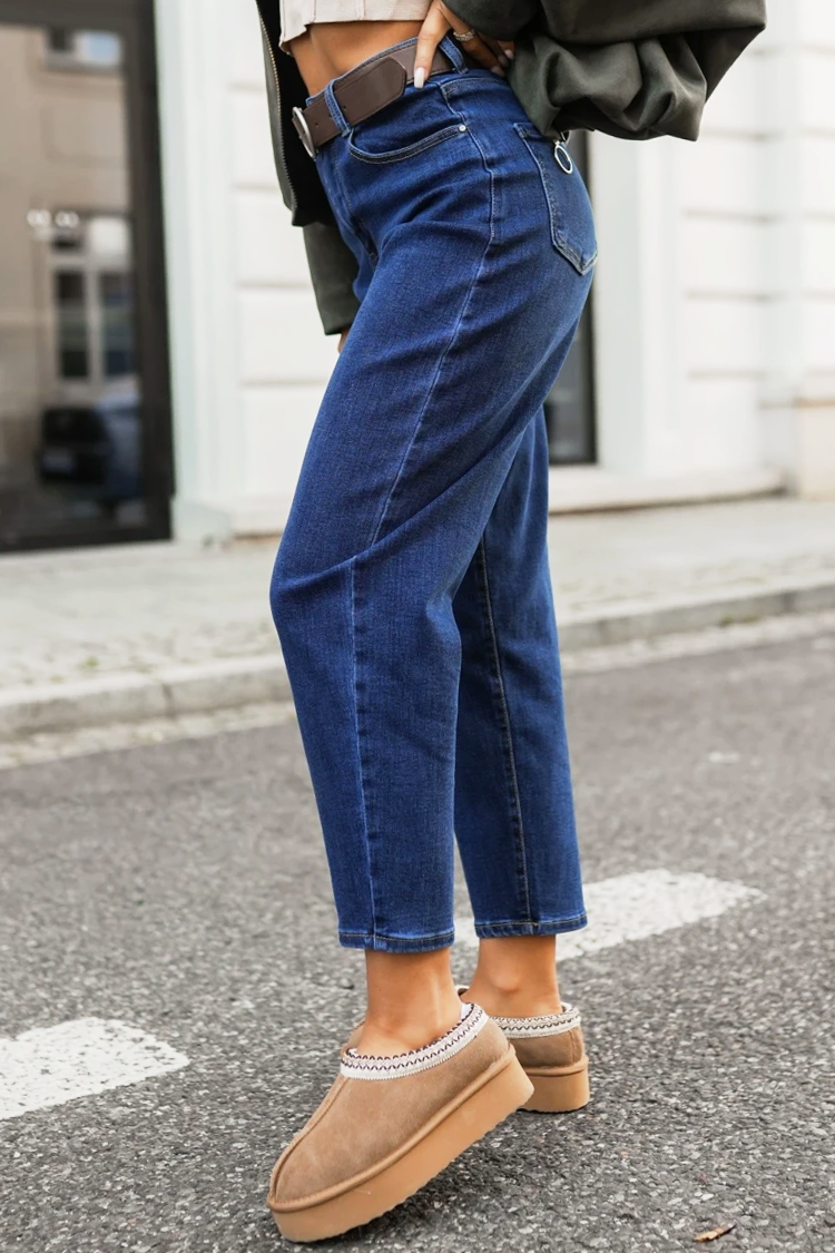 - Model ženskih traperica u tamnoplavoj boji, prikladan za svakodnevni život ili šetnju.