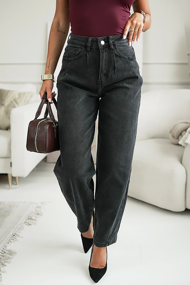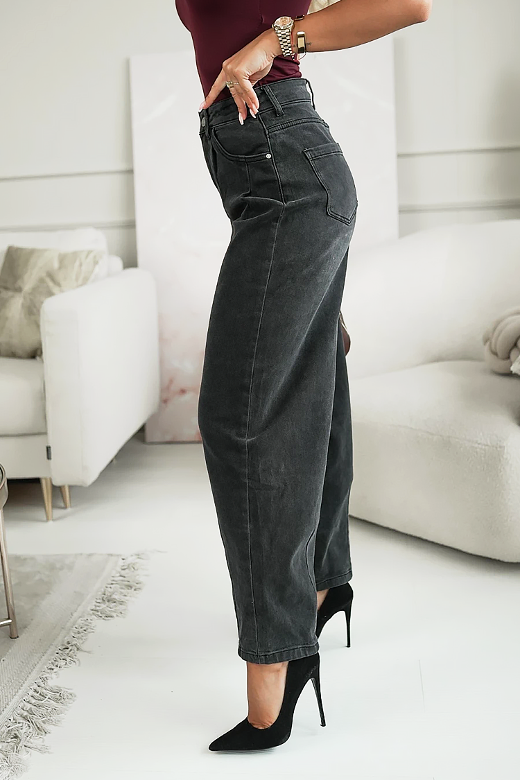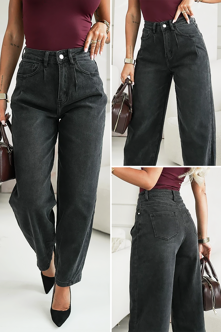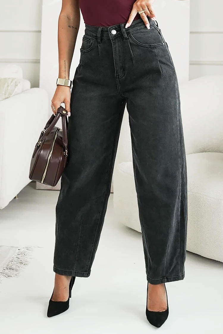 - Model ima visoki struk, čist dizajn i široke nogavice.