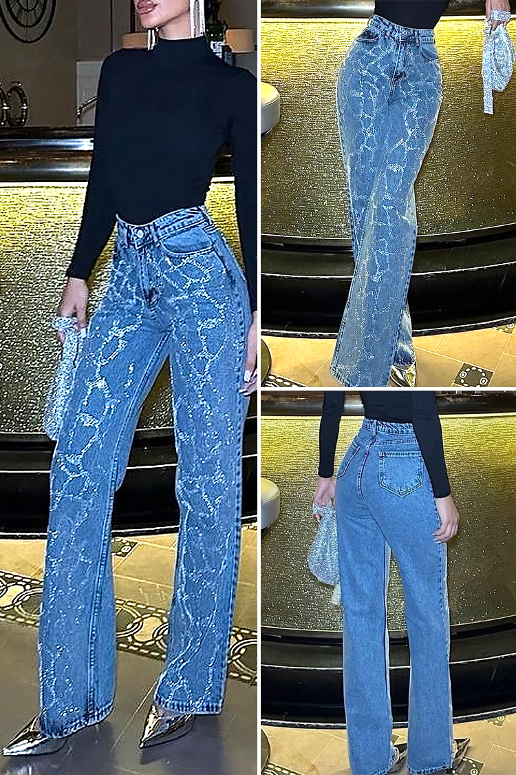 - Model ima visoki struk, široke nogavice i sjajne elemente.