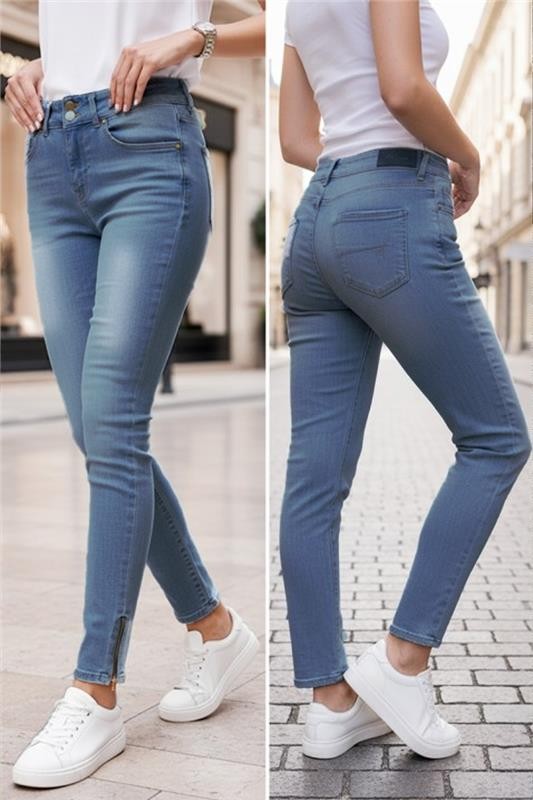 - Raznolikujte svoju garderobu praktičnim modelom plavih traperica s izbijeljenim efektom i patentnim zatvaračem na kraju nogavica.