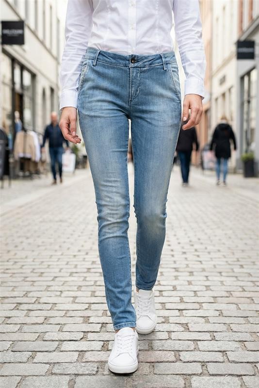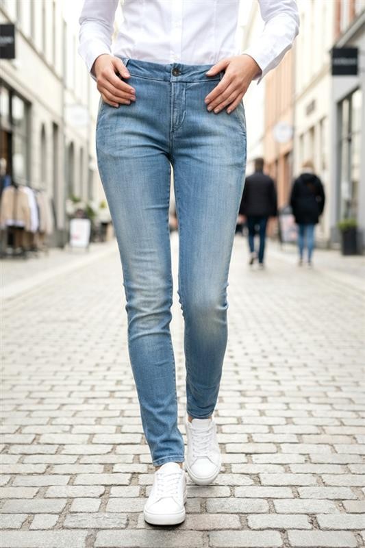 - Osnovni model ženskih traperica u svijetloplavoj boji s izbijeljenim efektom, prikladne za svakodnevni život ili šetnju.